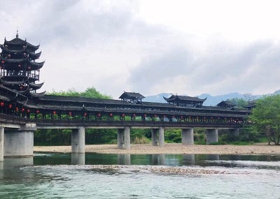 风雨桥又叫花桥,主要以实木为建筑材料,凿榫衔接,横穿竖插,整个建筑不用一钉一铆。外露木质部分涂以桐油,横跨溪河,经久耐用,被称为世界十大不可思议桥梁之一,因过往行人能避风挡雨,故名“风雨桥”。