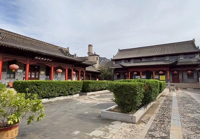 老君殿右侧为六层六檐八角密檐式砖塔,建于嘉庆二十五年(1820)。塔高20米,座径5.65米,底层7面分嵌砖质阳刻八封方位图案,8方均筑门洞假窗,东向门楣上有“阿弥陀佛”阳刻门匾,作工精细,保存完好。
